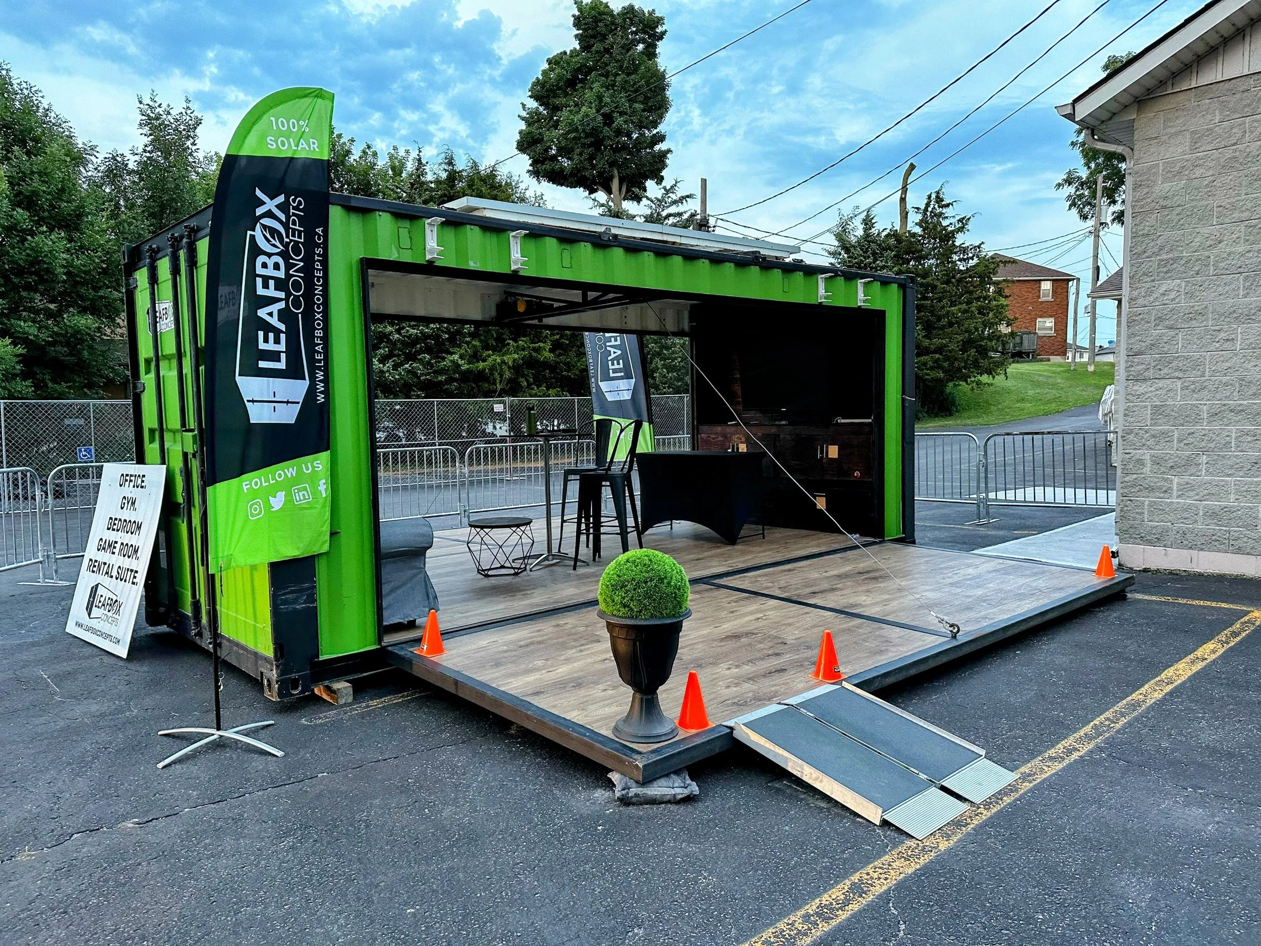 Bring your brand to life with the 20ft x 15ft LeafBox Shop, the perfect turnkey solution for merch sales and vendor booths at fairs, street festivals, and community events across the Greater Toronto and Hamilton Area (GTHA). This modern mobile shop provides a secure, weather-resistant space that’s easy to deliver, set up and close, giving vendors a lockable professional storefront without the hassle of tents or temporary builds. The LeafBox Shop includes a 50” TV which can be fully branded with your brand’s logo or sponsors. Ideal for food vendors, merch tables, ticketing, or community organizations, this mobile shop is designed to create a seamless experience for both vendors and event organizers.